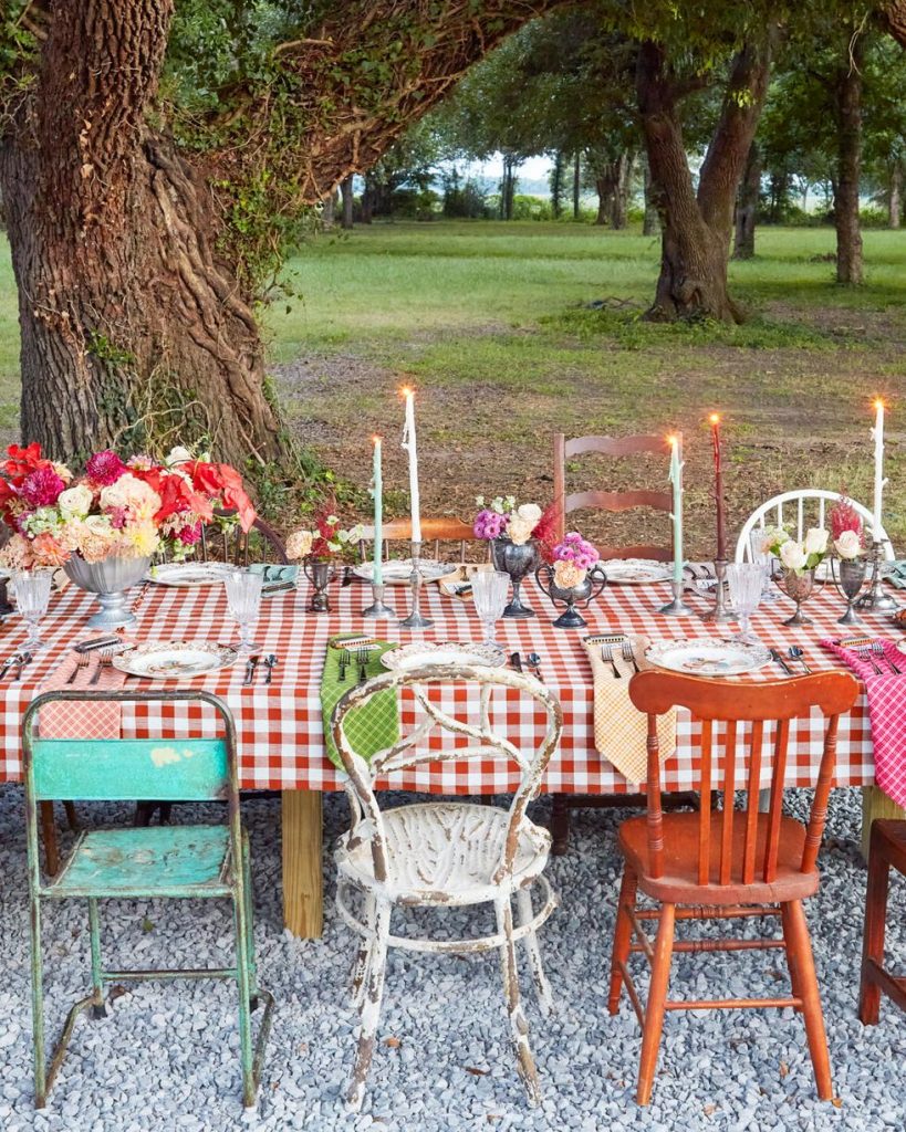 IDEA #1 – Make It Not Match – If you can set up a table outside…this is such a special time of year when the weather cooperates with outdoor dining. Love the vintage unmatched chairs, different colored cloth napkins, (you know how much I LOVE cloth napkins!!….and IRONED cloth napkins at that!)  The small aged silver vases filled with small flowers…tall candles and look closely. What is that you see on each and every cloth napkin?? It’s a harmonica! Now THAT is fun!  I’m not real excited about the chairs being on the rock floor; grass and dirt would be just fine. But it’s perfectly placed beside that big oak tree, so that matters 🙂