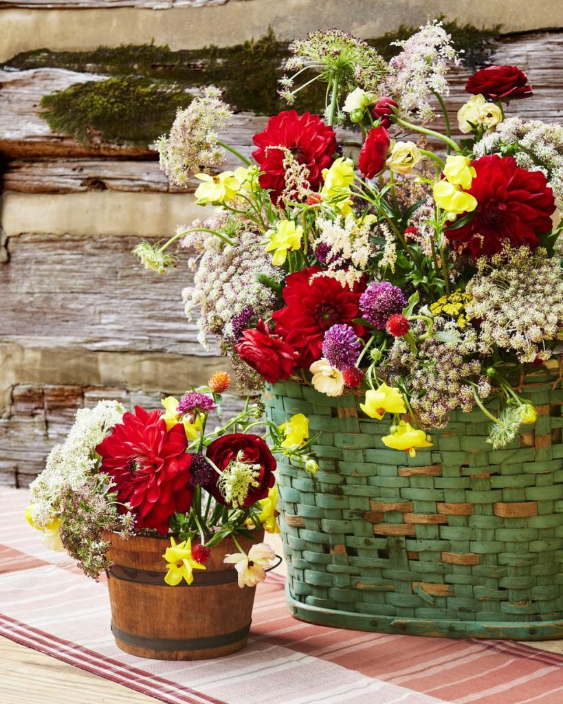 IDEA # 9 – Be Creative In the Flowers You Choose – Yes, I loved the idea of placing plants in these cute old spice containers, but what also caught my eye is the flowers they chose. There are some that are actually ‘flowers’ but they also used some sparse wild grass with them. Makes it whimsical and not so ‘prepared.’  But the amber glasses also are a great touch of color.