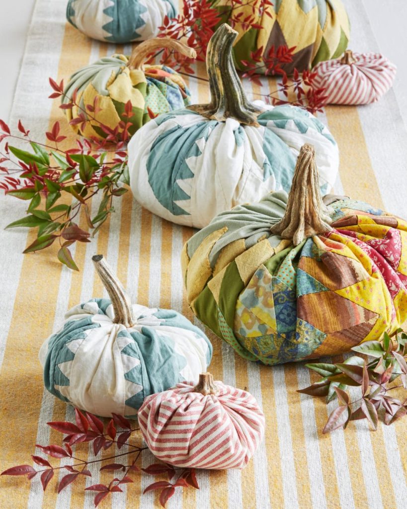 IDEA # 10 – Craft It! – These pumpkins are only 3 things – a ball of batting, a large circle of quilting fabric, and a faux stem.  You could make things country like what you see in this photo, or you can make them all white and spray the stem gold. Or make them all out of velvet, or burlap, corduroy or neutral plaids. But one thing that really makes a table special is when you sit down and see something that little hands made or that was simply homemade. It gives the table a little touch of … love.