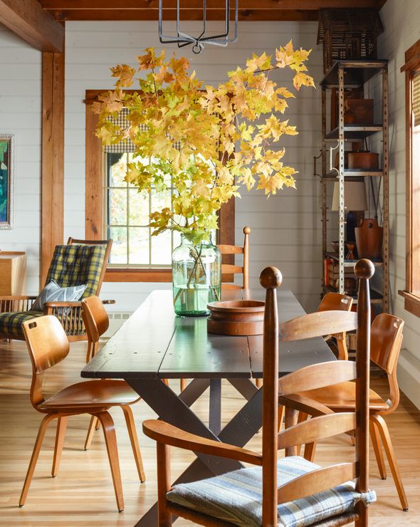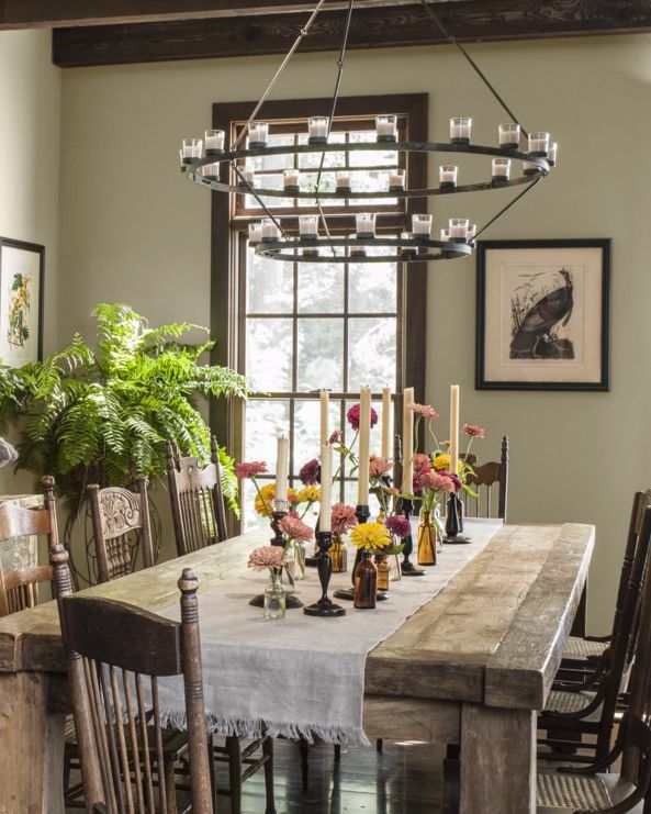 IDEA #4 – More Is Sometimes Needed – One thing that makes a forest grand is ALL the trees. Sometimes when you have a wide and long table, it’s inviting you to place more candlesticks, more vases, more pumpkins, more greenery… keeping everything centered, you can still create a beautiful fall table with a little bit of abundance. This table would also be beautiful if it had one long dough bowl full of foliage, or even a large dark container filled with tall branches. **Notice the mix of chairs again…love the charm of that!
