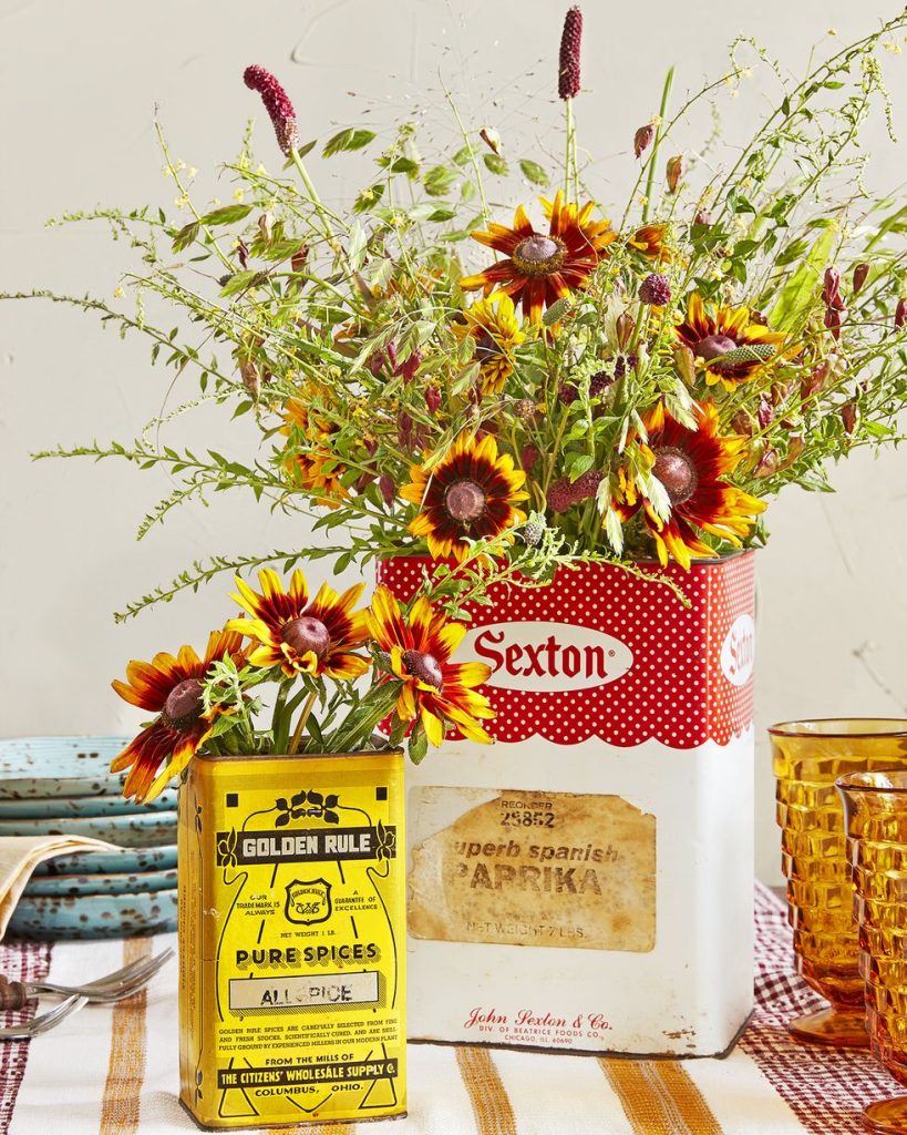 IDEA # 8 – Whatever You Have, Use It – When you get ready to display flowers or greenery, look around your work shop, your kids toys, the garden shed, and anywhere around the house where you can find containers and use them. It makes the table not only interesting, but great conversational pieces.