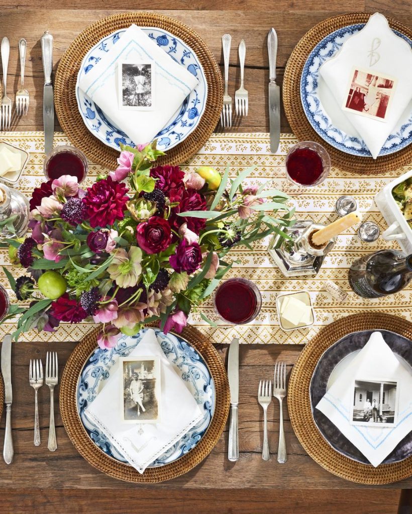 IDEA # 3 – Go Back In Time – There’s just so much darlin’ on this table…you can tell the homemaker put a good bit of thought behind what she wanted it to ‘say’ to her guests. She had me at, “Hello vintage photos of family” all centered on IRONED cloth vintage napkins. Blue and White contrasted with textured straw chargers (who would’ve thought!), and that beautiful table runner giving the perfect platform for a beautiful floral arrangement to be center stage!