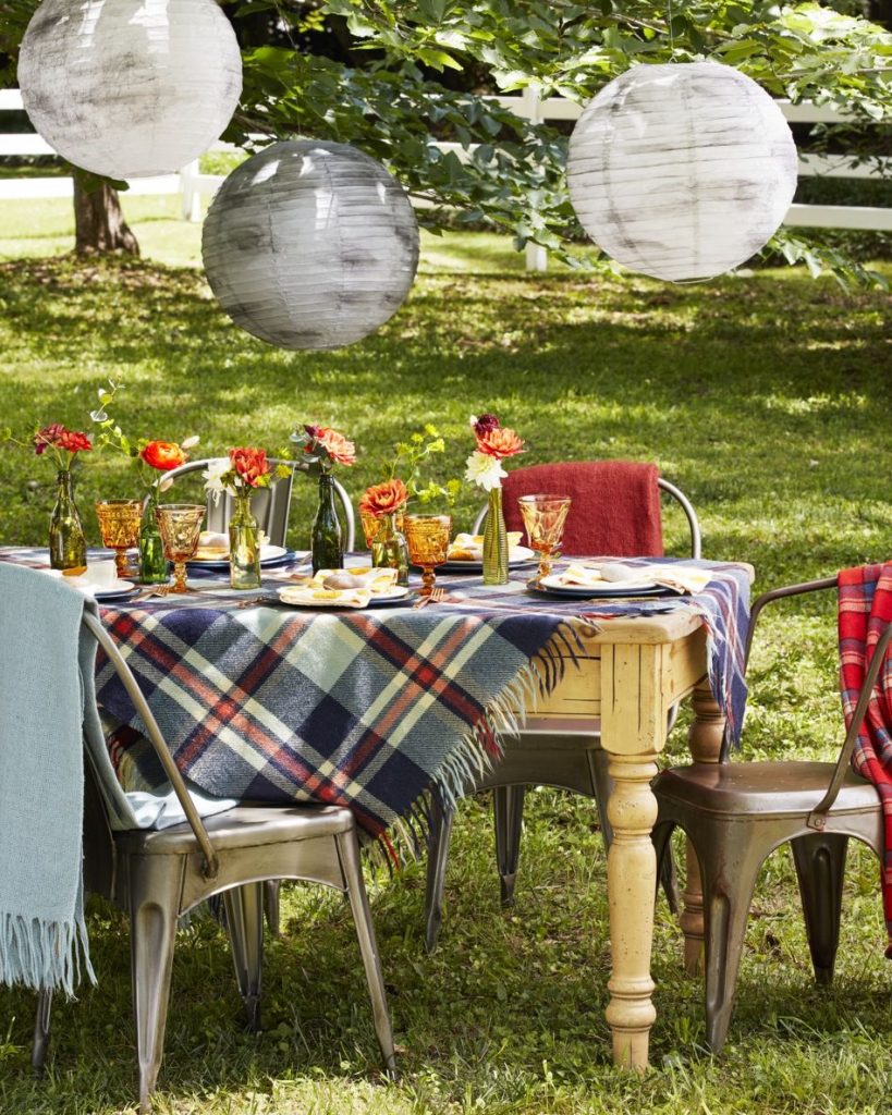 IDEA #2 – Simple and Cozy –  The 3 large paper balls may not be to your liking, but the rest of this is so cozy. They threw a blanket over the table, tossed a few more over the chairs and set the table all with glassware. Simple and perfect for an outdoor brunch or evening meal.