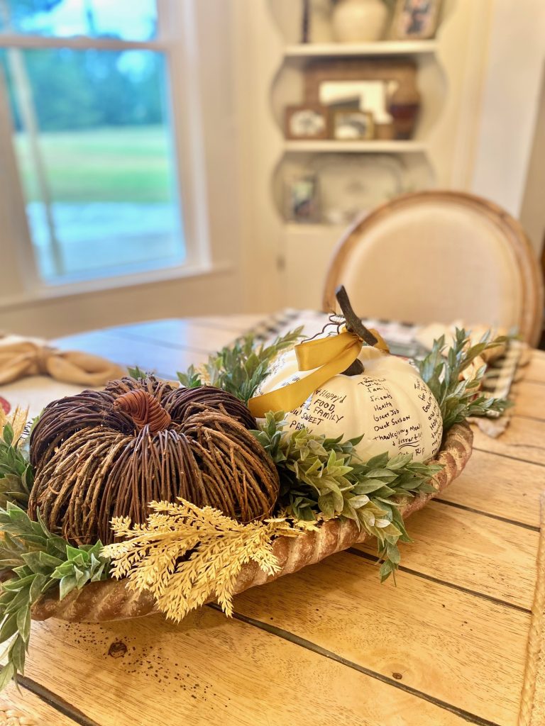 This next photo is our kitchen table. I wanted something simple, nothing that needed watering or much care, and could easily be removed when it’s time to place a 2-3 course meal on the table. So, I took a stone oblong bowl, placed two pumpkins inside, and stuffed in some faux plants from Hobby Lobby along the sides and Viola! A centerpiece is made! One of the pumpkins was actually an activity we did with my parents, daughter and son-in-law. We each wrote what we were thankful for on the pumpkin, so now it’s not only a reminder of the goodness and grace of God, but is a daily visual of family! The placemats are some I picked up in Columbia TN last year at their local Dollar Tree…and they are the cutest things!