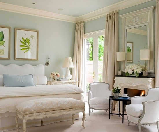 Looking for a country farmhouse style to your bedroom? This works! The walls are painted a pale pale pink or peach, and then the pops of soft blue against the white bed frame and linens is just adorable! I love how even the art above the bed keeps that soft dusty pink that’s on the walls, in the throw on the bed and even the floors are a deeper tone of that same color. Not to overlook that cute little sea shell on the bedside table just waiting for someone to listen to the ocean! In this bedroom, it is the flooring that creates the contrast and it determined the wall color and the rest of the accessories. If the wall was painted a creamy soft white, that would be beautiful too. The color White Tail by Sherwin Williams would be absolutely gorgeous in a room with these warm and cool colors.