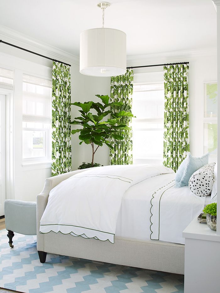 Here’s a great example of how to work with “contrasts.” The room is so well balanced in the whites and soft blues, but then they really created an inviting space with the contrast of dark green drapes hung on a clean black rod and then added a dark green tall plant in the corner.