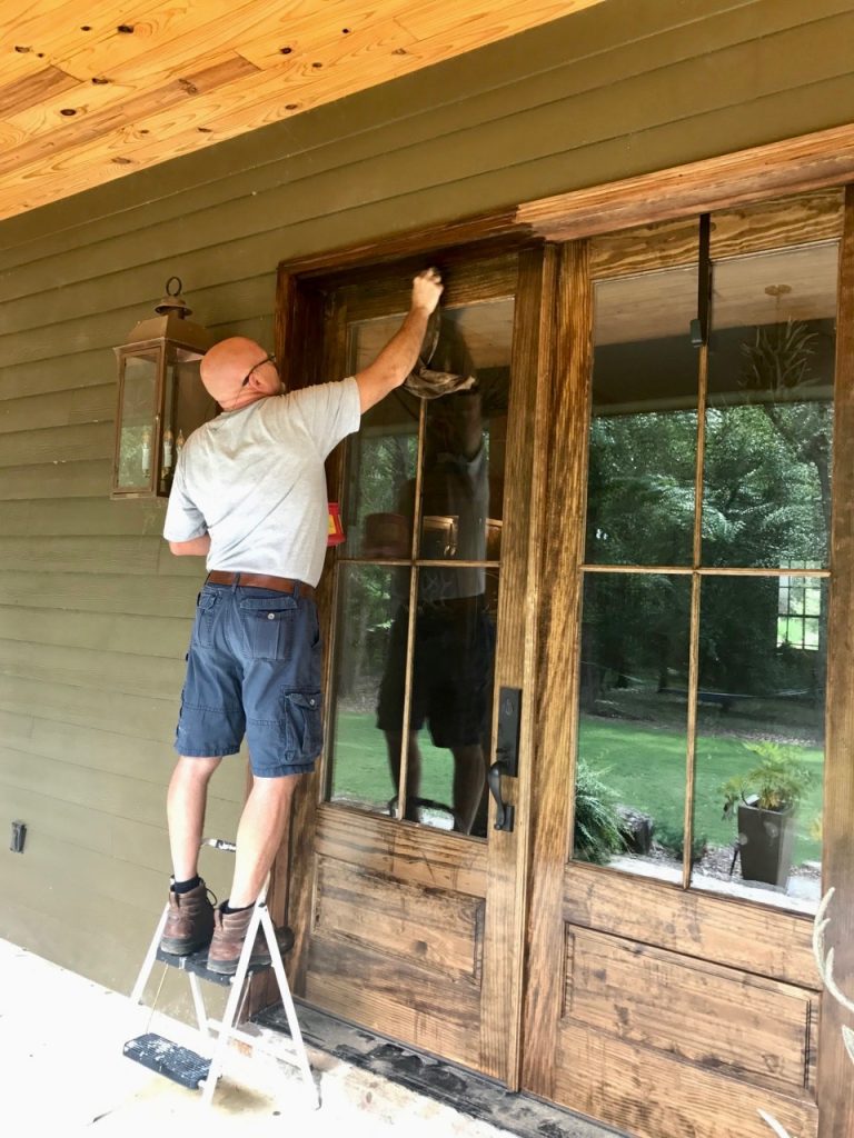 2. Start with the exterior. In the above featured image, the homeowner hired our company to restain their doors and the back screened-in porch, and all the cypress wood trim. They also had a stove vent-a-hood on their back porch that needed cleaning and fresh staining. Some of the screens had been torn and needed to be replaced. The back doors of the house that led to the back porch also needed an uplift – so they all got sanded, stained and sealed.   So – be sure to look at your roof, soffits, gutters, facia. What do you see around the entire exterior of your home that may need: repair, a fresh coat of paint, or to be cleaned?