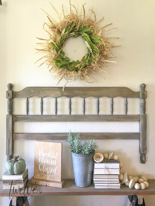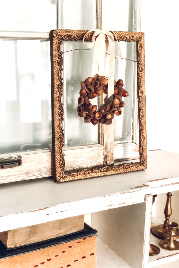 I love the simplicity of how they took small acorns and wired them to make this mini-wreath. Use an unwired ribbon and loosely tie the wreath to the frame and place it anywhere! Anywhere! In the kitchen on the window, on a mantle, on a bookshelf, in a bathroom behind the toilet, in the family room hanging on the wall. It’s such a dainty and simple touch of fall that can be made from cattails, too.