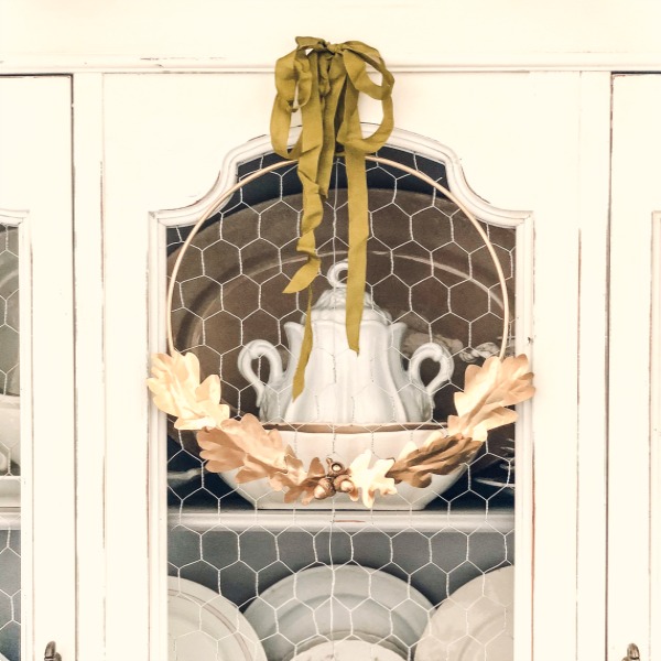 Another really french thing to do would be to get your leaves off a couple of oak trees while they are fresh and green. Place them on newspaper and spray them different shades of gold. Attach them to a gold ring you can pick up at Hobby Lobby or HERE and tie a beautiful unwired ribbon bow at the top. In this hutch, there is nothing but all white dishes and that makes for such an elegant look. But if you want to go for a more casual look, and still have some of that elegance, mix up the white with grays, blues, greens …. let the shades of nature come into furniture pieces like this with the dishes, glassware, etc.