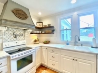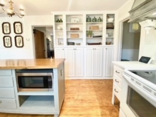 One of the first places we renovated was the kitchen. Removed kitchen cabinets and added a custom made vent hood, (custom made means “Rip made!), 6 floating shelves, and a Rip-Made Island – he took a long cabinet and converted it into an island and added a floor outlet for the microwave and two outlets on each end of the island…with a phone charger, too. We pulled up the sheet linoleum and sanded/stained/sealed the original pine floors. And we replaced the windows with all new windows and added several several more…there are a total of 32 windows!