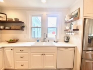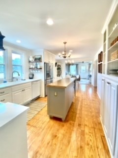 We painted the walls Sanctuary by Sherwin Williams and the trim throughout the house is painted Snowbound by Sherwin Williams. The kitchen cabinets are Greek Villa by Sherwin Williams. Countertop is a new quartz white with a slight grey marbling.