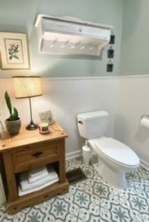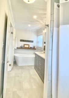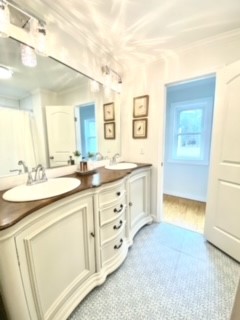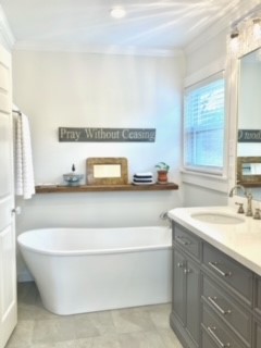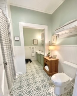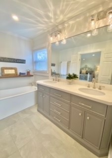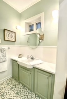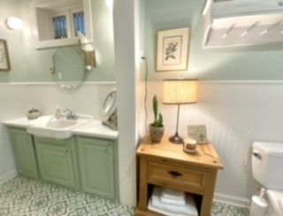 When you come into the house from the back door, it is a small hall filled with windows so all the natural light can come pouring in. Immediately to your right is a bathroom – light blue floor tiles, with a double sink vanity – (A dresser found at a local consignment store we converted into the vanity), and a large mirror trimmed and painted – Sanctuary on walls, Snowbound on trim. Vanity painted an Annie Sloan chalk paint and sealed with a matte poly. There is a tub and shower in this bathroom … all new with tiles to the ceiling. Off the bathroom is a bedroom – king size bed fits great in this room. It provides a lot of natural light and a closet with double rods.