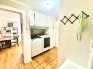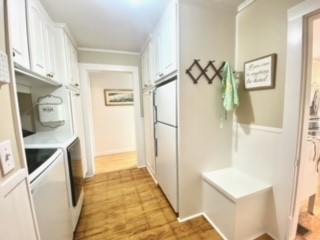 As you come out of the back entry hallway and out of the bedroom, you can walk right through this duel purpose space – the laundry space that also has been trimmed out to hold another refrigerator. Plenty of storage in this space, too….and a cute little built-in bench to drop your purse or to sit and take off your boots!
