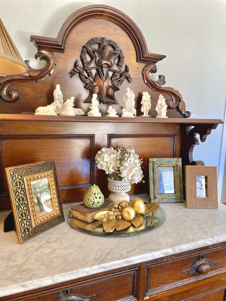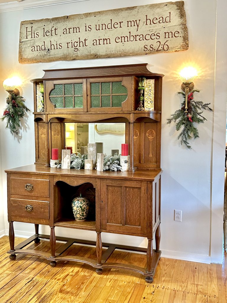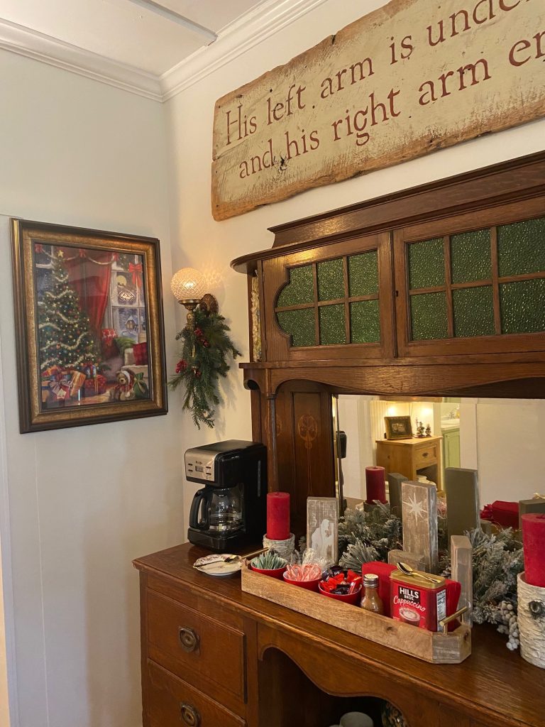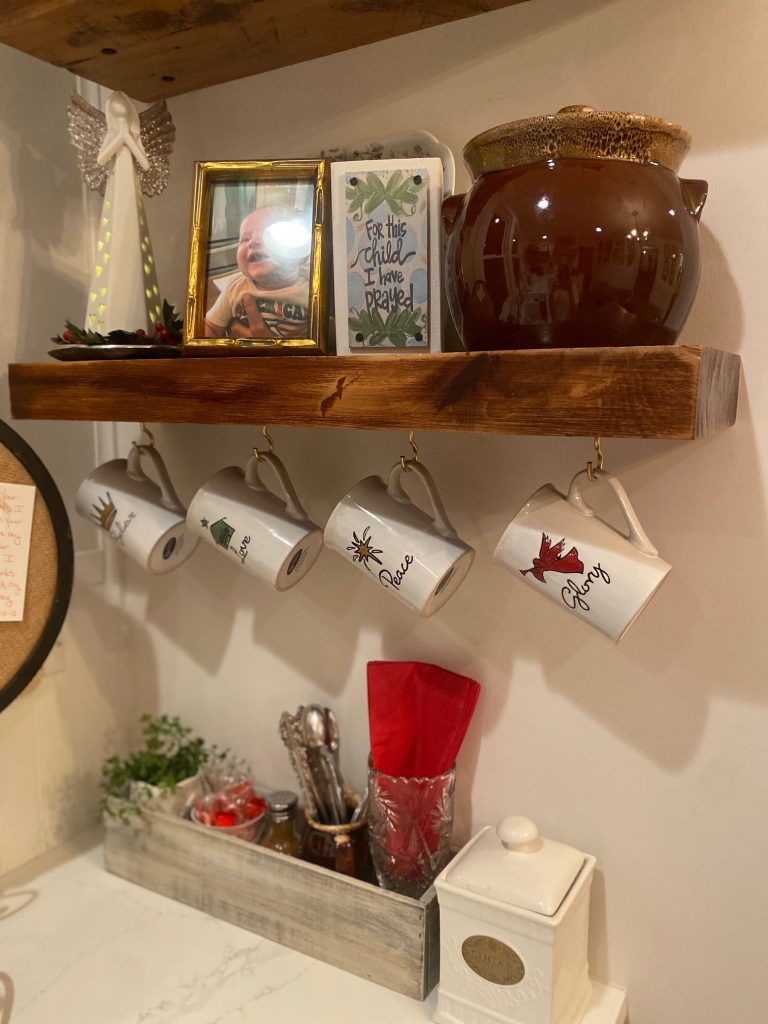 The kitchen coffee service had all the same, except instead of the English Toffee Creamer, I put out Simple Truth Vanilla Creamer. The floating shelf that Rip made has precious Nathan is framed next two an angel that Mimi (Lisa Harris) gave me. When I turn it on, it gives off a soft white light. And the little “For this child I prayed” block was also a gift from Kristi Horne as a “Congratulations In Becoming a Grannie” happy! The Christmas mugs are a hand-me-down from my parents and that big brown jar holds our favorite coffee – Community Coffee with Chicory.