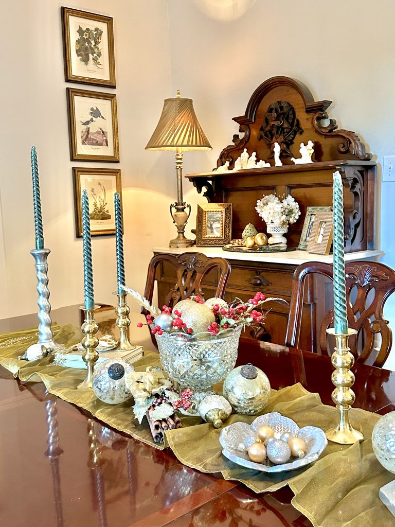 Because there were so many coffee drinkers coming, I set up two coffee services. One here in the dining room, next to last year’s Christmas puzzle. After I Mod Podged it, we framed it because it’s one of those new Christmas traditions! But the coffee service has some Cappuccino English Toffee Creamer, Cinnamon, a bowl of small individually wrapped chocolates, and Stevia Packets.