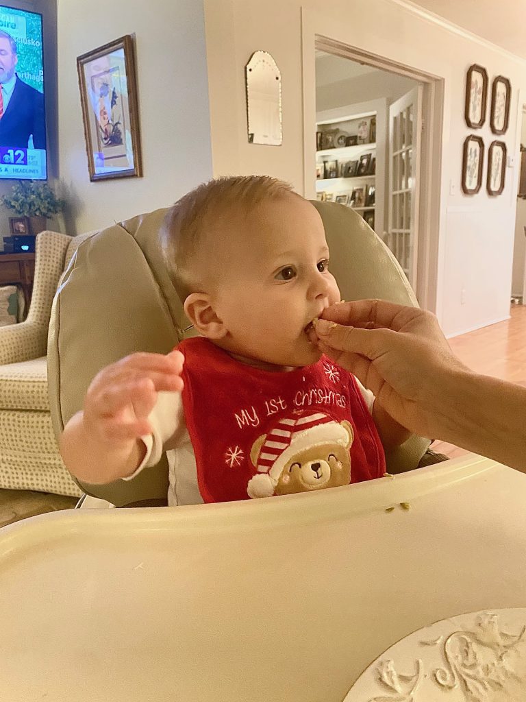 Nathan having his 1st Christmas dinner at Lolli and Pops, wearing the bib his Nana (Irma Rippy) got for him.
